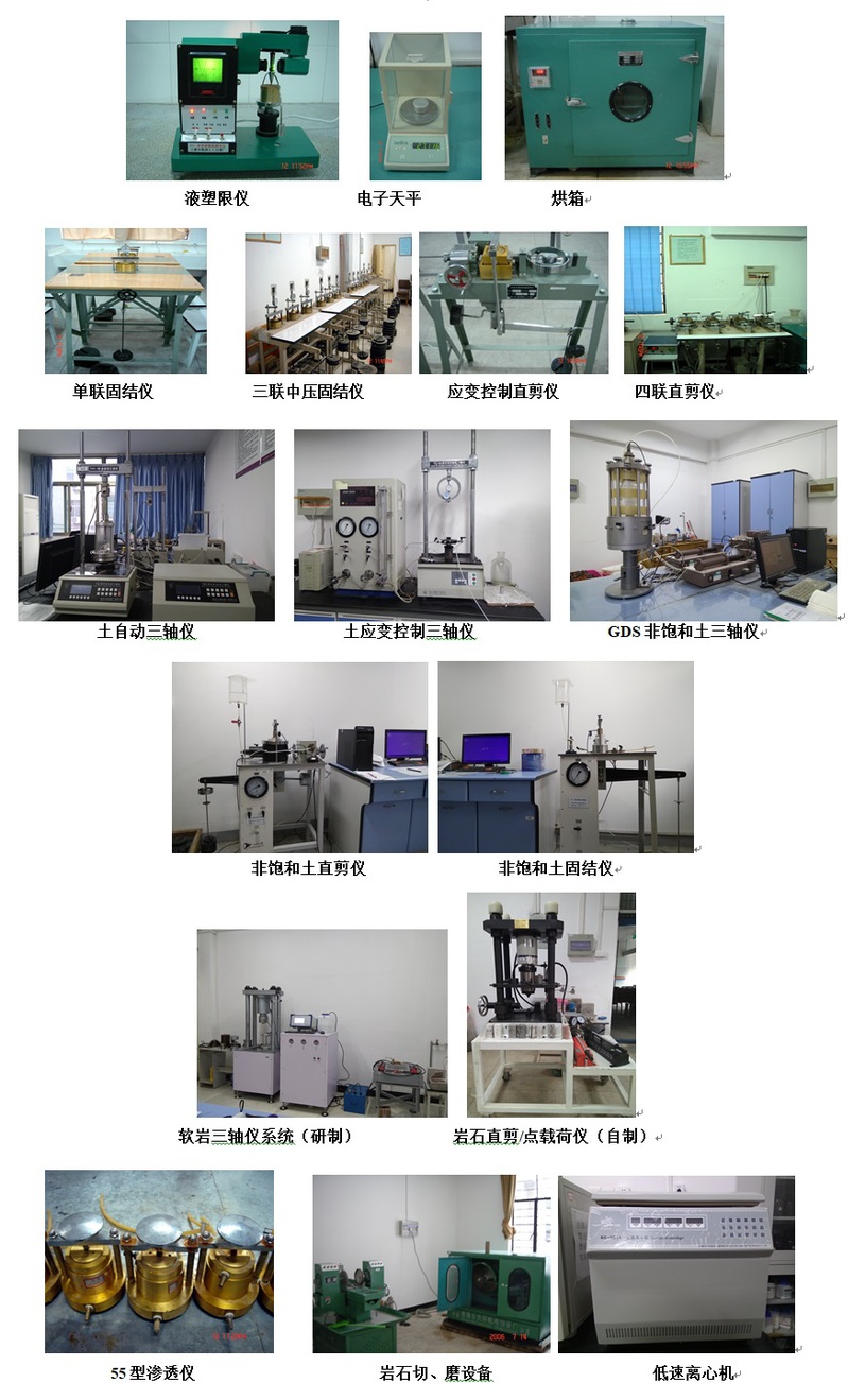 下设多个实验分室:土的物理性质实验室、土的力学性质实验室、土的三轴实验室、GDS三轴实验室、岩石力学实验室(岩石三轴室、岩石制样室)。