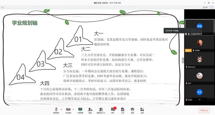 为进一步加强疫情防控期间学生思想政治教育和班风学风建设,丰富学院第二课堂活动体系,充分发挥榜样引领作用,教育引导青年学子向榜样看齐、向榜样学习,3月21日至28日,污污漫画 以网为媒,发挥线上实时互动的优势,组织开展了青年校友线上校园行系列活动。活动邀请了现在同济大学、浙江大学、西安交通大学、大连理工大学、中南大学、湖南大学、英国格拉斯哥大学等攻读硕士研究生的青年校友面向2019级学生进行了线上分享交流。