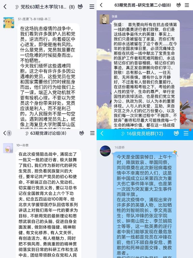 国旗半垂,举国同悲。国务院发布公告,决定2020年4月4日举行全国性哀悼活动。在此期间,全国和驻外使领馆下半旗志哀,全国停止公共娱乐活动。4月4日10时起,全国人民默哀3分钟,汽车、火车、舰船鸣笛,防空警报鸣响。学院各学生党支部、党校学员班通过共同学习抗击疫情期间一系列鲜活案例、观看抗疫视频资料、组织集中讨论,围绕“党员微光‘疫’路闪耀”、“最美逆行者 舍小家顾大家”、“初心不改 誓言不变”等方面展开,引导学员缅怀在这场防疫战争中不幸离世的英雄先烈,寄托对烈士和逝世同胞的哀思,牢记入党初心使命,树立战“疫”青年应有的责任担当,号召广大党员和同学将本次抗击疫情当作坚定忠诚奉献、实现爱党爱国、敬畏岗位职责、坚守职业操守、增强斗争精神,提升政治能力、增强号令意识、遵守规矩底线的课堂,向榜样看齐,坚定入党初心使命,努力为夺取战疫全面胜利和中华民族伟大复兴“中国梦”的实现做出应有的贡献。
