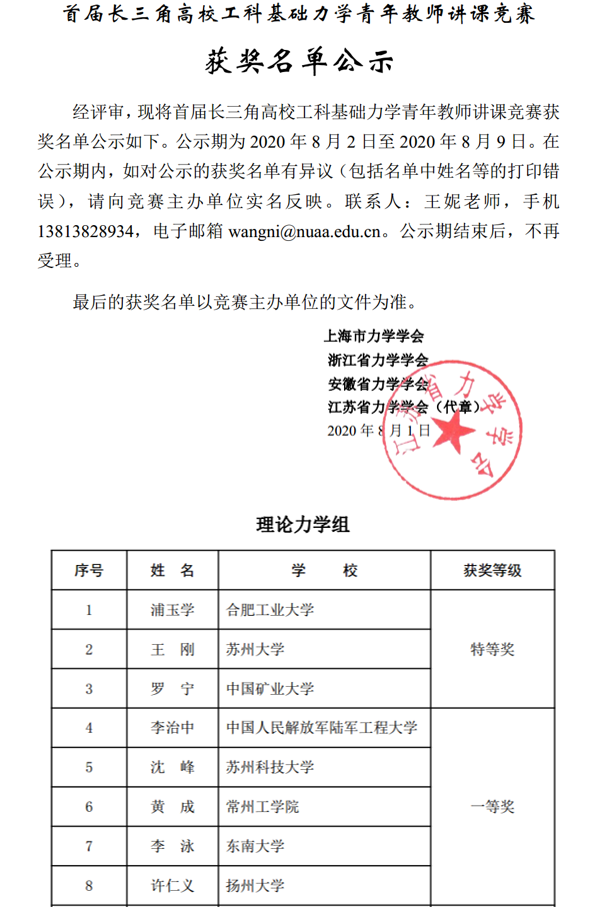 浦玉学获首届长三角高校工科基础力学青年教师讲课竞赛特等奖