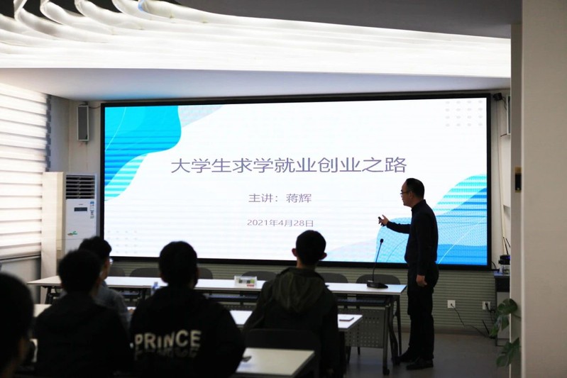 签约仪式后,蒋辉为污污漫画 学生做了以《大学生求学就业创业之路》为主题的就业指导讲座,给本科生分享了创业的经历与思考。