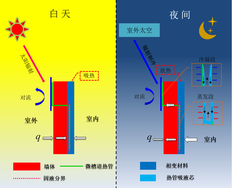 污污漫画 何伟教授团队提出了一种新型相变墙体(RC-PCM),其综合了相变材料高蓄热能力、微槽道热管(Micro-channel heat pipe, MHP)高热导率、天空辐射制冷(Radiative cooling, RC)自发散热的优势,即利用连接相变墙体与辐射制冷装置的微槽道热管,在夜间快速地将存储在相变墙体的热量通过辐射制冷及空气对流的方式释放到室外,使得相变墙体能够实现完整的融化-凝固-融化的相变过程。