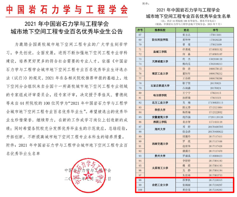 2021届全国高校城市地下空间工程专业百名优秀毕业生”评选活动由中国岩石力学与工程学会组织,全国开设城市地下空间工程专业的东南大学、重庆大学、西南交通大学等几十所高校参加。本活动表彰先进、树立典型,激励全国高校城市地下空间工程专业学子以服务我国城市建设为己任,希望各校充分发挥优秀毕业生的示范效应,不断提高城市地下空间工程专业学生培养质量。