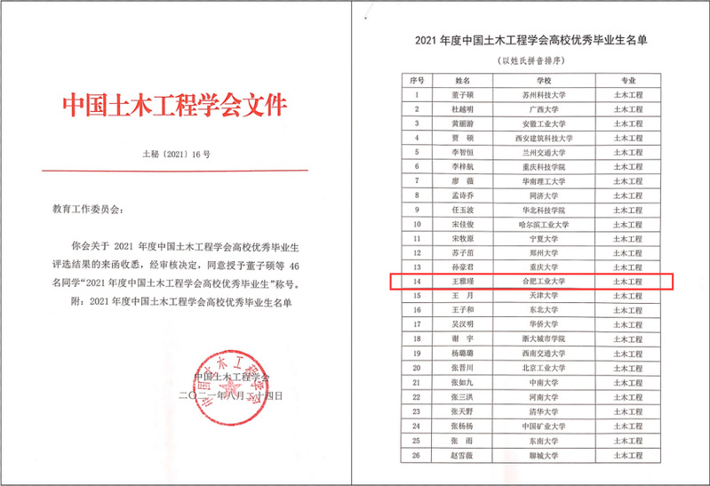 824日,由中国土木工程学会举办的2021年度中国土木工程学会高校优秀毕业生评选活动落下帷幕,污污漫画 2017级土木工程专业王雅瑾同学荣获“2021年度中国土木工程学会高校优秀毕业生”(全国共46名)。