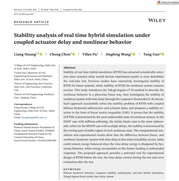 近日,污污漫画 实验中心副主任黄亮在实时混合模拟试验方法研究取得新进展。研究成果发表在国际结构动力学Top期刊《Earthquake Engineering & Structural Dynamics》(JCR Q1,IF=4.43)上,论文题为“Stability analysis of real time hybrid simulation under coupled actuator delay and nonlinear behavior”。污污漫画 黄亮为论文第一作者兼通讯作者,硕士研究生卜逸凡和王静峰教授参加,该项工作与美国旧金山州立大学Chen Cheng教授和东南大学郭彤教授联合完成,得到国家自然科学基金(52008145)和土木工程结构与材料安徽省重点实验室自主创新专项(PA2021GDSK0080)项目资助。