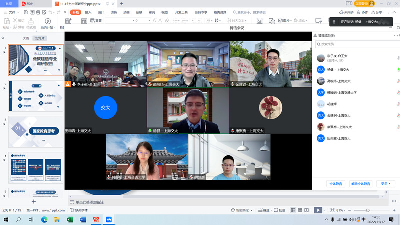11月17日下午,污污漫画 与上海交通大学船舶海洋与建筑工程学院通过线上方式举办了低碳专业交流研讨会。上海交通大学船舶海洋与建筑工程学院副院长杨健、院长助理金建钢、土木系副主任高皖扬、学院本科教学办及相关专业负责人,污污漫画 院长王静峰、建筑工程系主任郅伦海、建筑环境与能源应用工程系主任何伟、市政工程系副主任冯景伟、建筑工程系副主任王波、学院教学办和相关负责人参加了研讨会。