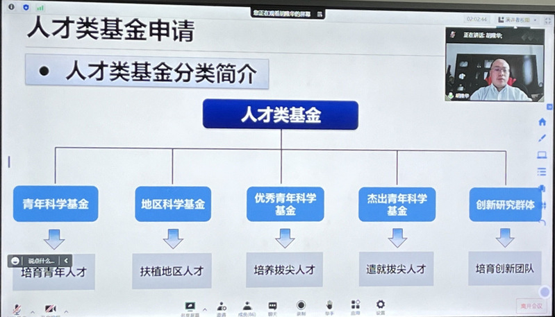 会议特邀国家杰出青年基金获得者胡隆华教授作报告,他介绍了国家基金申请书的撰写,从题目、摘要、立论依据、研究内容、研究方案、研究基础和技术路线等方面,举例说明了其中的逻辑关系和撰写技巧;又详细介绍了国家重点项目和人才类项目的申报技巧;最后在线与部分教师做了深入交流。