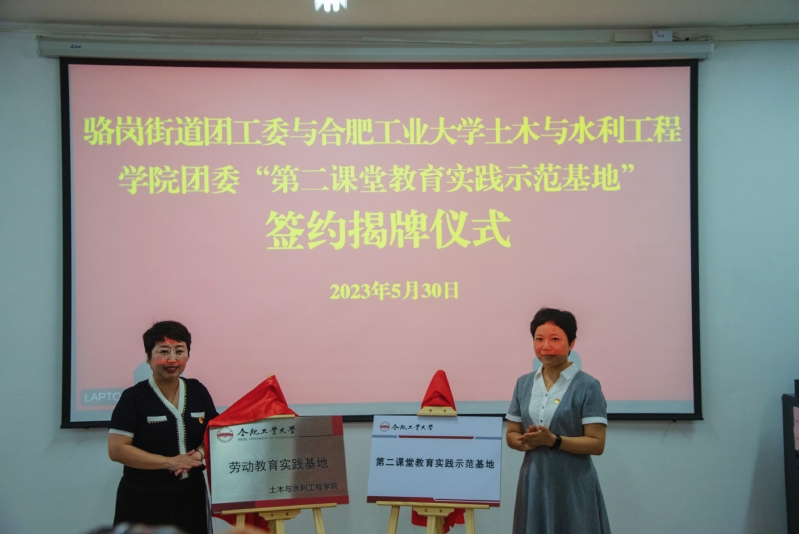 学院团委书记李雪与骆岗街道团工委书记张欢签订“第二课堂”教育实践示范基地共建协议、劳动教育实践基地协议;魏婷与许春雨共同为“第二课堂”教育实践示范基地、劳动教育实践基地揭牌。签约仪式结束后,骆岗街道12位社区团总支书记与学院各学生团支部书记就社区志愿服务活动开展计划互换意见。
