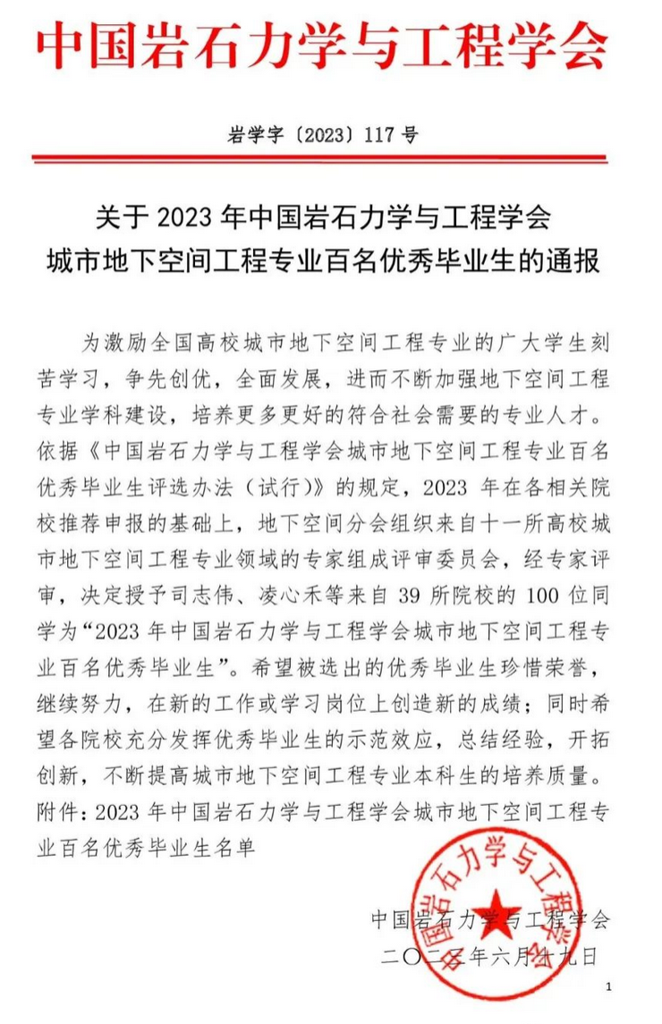 近日,中国岩石力学与工程学会发布了《关于2023年中国岩石力学与工程学会城市地下空间工程专业百名优秀毕业生的通报》,宣城校区城市建设工程系城市地下空间工程专业2023届毕业生干天宇、宋佳乐、张屹捷、辛江原、杨浩宇、徐子铭6位同学获“2023年中国岩石力学与工程学会城市地下空间工程专业百名优秀毕业生”荣誉称号。