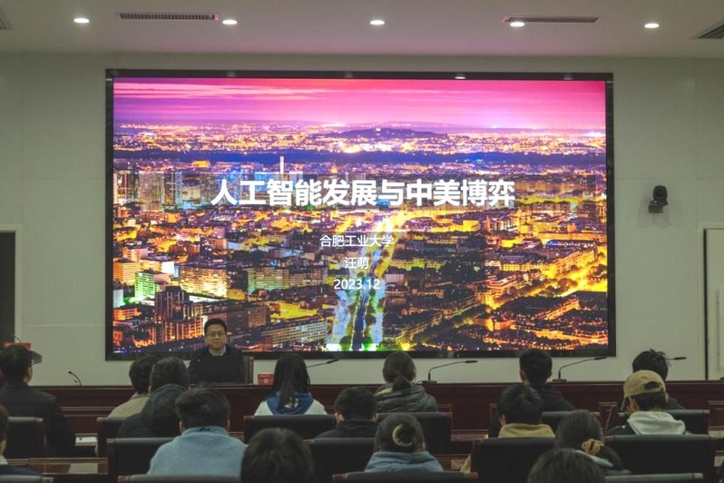 汪萌校长由人工智能的发展引入,向参会师生解析了国际局势复杂多变、风高浪急的形势,强调当今世界正经历百年未有之大变局。接着带领大家认真学习国家《新一代人工智能发展规划》和《安徽省通用人工智能产业创新发展三年行动计划(20232025年)》文件精神,引导师生们深入思考人工智能发展对国际局势的影响,以及如何在新一轮的科技革命和产业变革中抓住机遇,为推动国家科技创新和社会进步做出贡献。