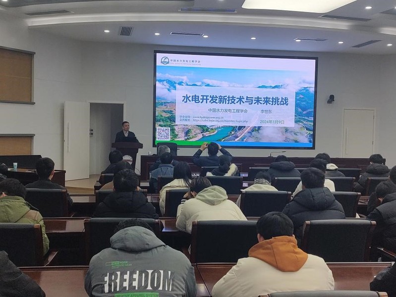 交流会结束后,李世东副秘书长作了题为 “水电新技术及应用”的报告,报告中强调中国水电发展处于世界领先地位,重大水利工程建设实现历史性突破。秘书长助理兼科普部主任杨永江介绍了“双碳与水电发展”,指出面向“双碳”国家战略,未来水电发展将更加多样化,并朝着水电、风电、光伏发电等互补的方向发展,需要大量水电建设人才的加入,希望同学们努力学习、开拓进取,为未来水电事业的发展做出积极的贡献。学院相关教师和近百名学生参加报告会,并与专家进一步互动交流。