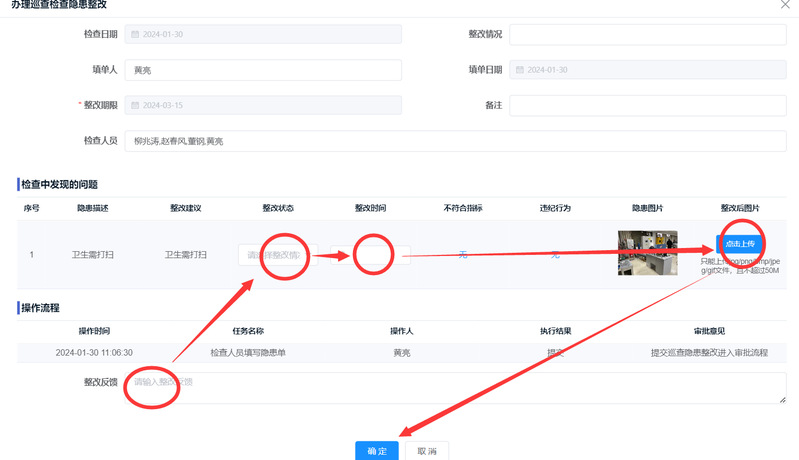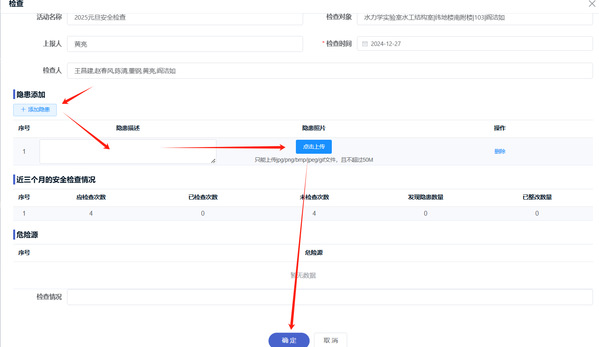 添加隐患→ 隐患描述→ 上传图片→ 确定 | ![]() |