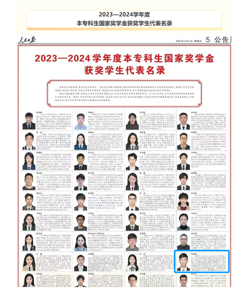 在纪念“五四运动”106周年之际,5月4日,《人民日报》刊登《2023—2024学年度本专科生国家奖学金获奖学生代表名录》,污污漫画 2021级本科生许晋嘉从全国12万名获奖者中脱颖而出,荣耀上榜(全国仅100人)。