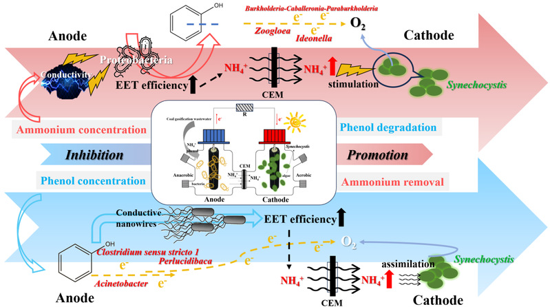 针对上述难题,研究团队开发的新型菌藻微生物燃料电池(AMFC)系统展现出独特优势。该系统巧妙地整合了电活性细菌和集胞藻的胞外电子传递优势,在系统运行过程中实现了酚氨的协同脱除(图1)。在AMFC系统中,阳极的电活性细菌通过代谢酚类污染物产生电子,形成电势差驱动NH4+的定向迁移。与此同时,阴极的集胞藻在光合作用过程中不仅产生氧气建立电子传递通路,还通过同化NH4+实现氮的固定与转化。这一创新设计成功地将传统处理过程中相互抑制的酚和氨两种污染物,在AMFC系统中转化为相互促进的关系。通过调控污染物浓度,系统的电化学活性得到显著提升,污染物迁移速率加快,同时特定功能微生物对污染物的降解效率也大幅提高。这种创新性的协同处理策略为煤化工及类似复杂工业废水的高效处理提供了全新思路,展现出良好的应用前景。