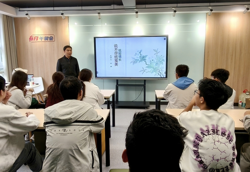 活动中,刘靖深入浅出地讲解了纸笺的悠久历史,并详尽地介绍了其精妙的制作工艺、丰富多样的种类及其独特艺术价值,带领大家领略了纸笺艺术的独特魅力。在互动体验环节,刘靖现场演示了纸笺制作的关键步骤,如染色、施胶、填粉、施蜡、托裱等邀请在场同学亲身参与实践操作,让大家在实践中感受传统纸笺制作的乐趣。