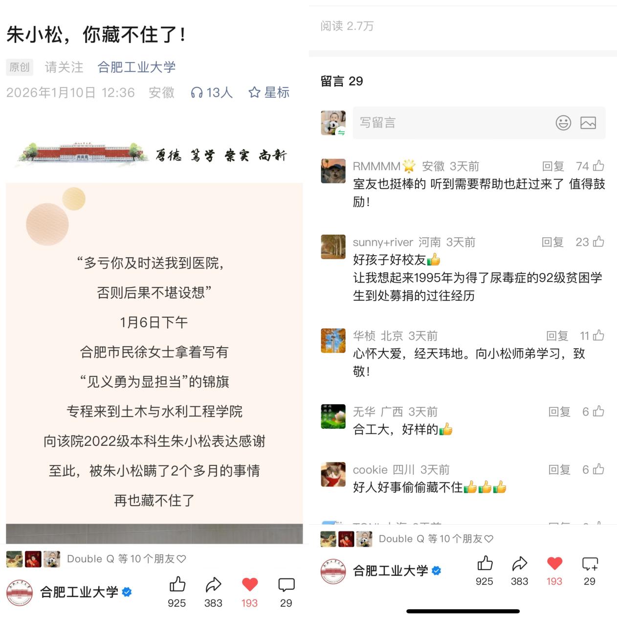 文章发布后,短短一天内阅读量迅速突破2.5万人次,点赞、转发和留言数量持续攀升。师生、校友及社会各界人士纷纷在推送下方留言,表达对朱小松同学的赞赏与支持。“合工大,好样的!”“工大的孩子们就是很棒!”“为这样的合工大人骄傲!”……留言区充满了温暖而真挚的赞誉。许多同学表示,朱小松的行为让他们深受感动和教育,也激发了更多人思考如何在他人需要时伸出援手。